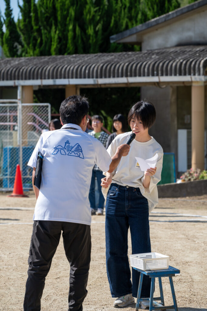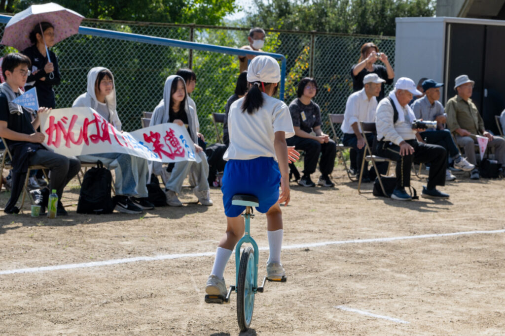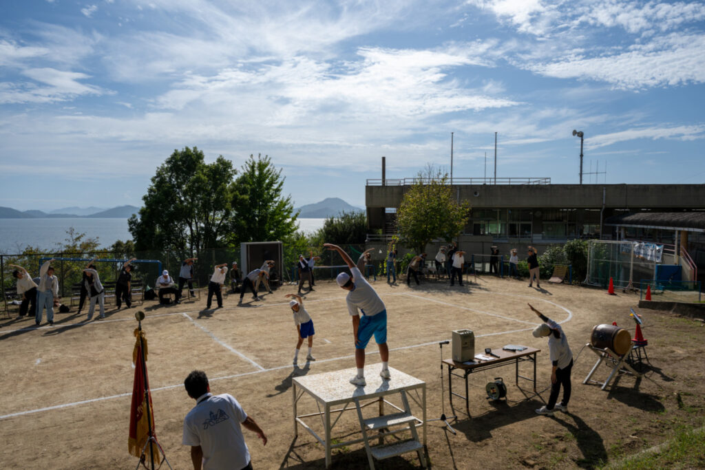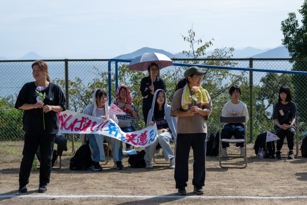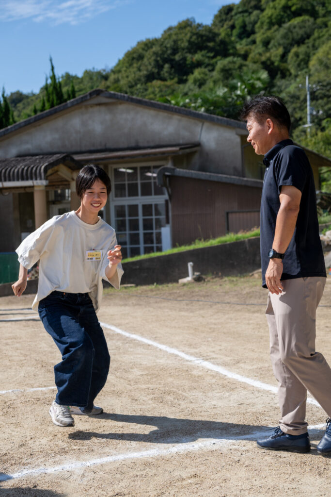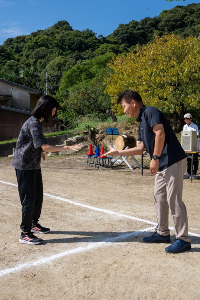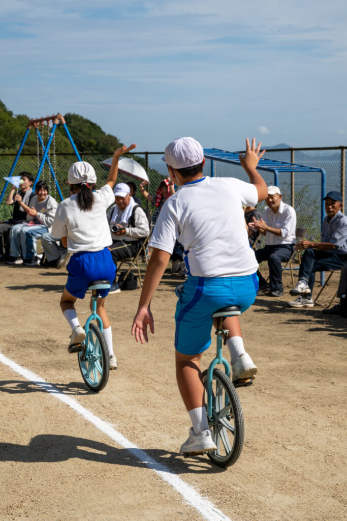 堂々として入場行進には会場から大きな拍手がありました。メインは2人による一輪車の練習成果の披露、借り物競争、じゃんけんリレー等、参観者も一緒に体を動かしました。参観の島の方々も70代がほとんどで、高校生が率先して参加してくれて本当に助かった感じです。島の方々もその動きに背中を押される感じでいい感じで交流が出来ました。