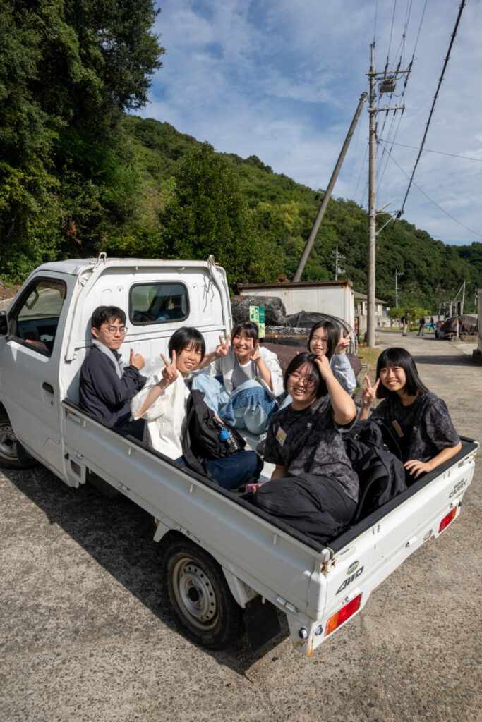 六島湛江港に到着。軽トラの荷台へ乗る体験を・・・。決してこのまま動いてはいません。