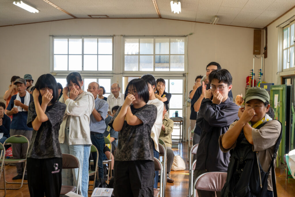 10:00 六島小いきいきファスティバル開会です。島民の方々も大勢集まっていらっしゃいます。高校生のミッションは六島小学校2名の応援と島民の方々と一緒にいきいきフェスティバルを盛り上げることです。なんせ、児童2人、先生3人の学校ですから、参観者の参加型のいきいきフェスティバルです。
