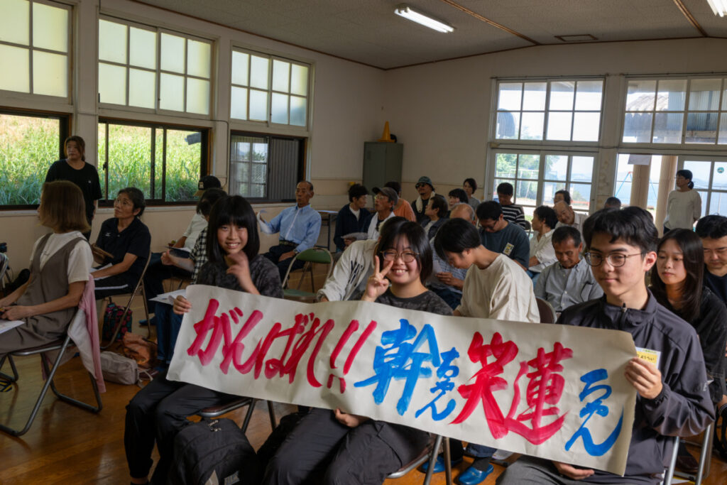 横断幕をもって、最前列で応援方々いろいろと2人の発表に聞き入っていました。