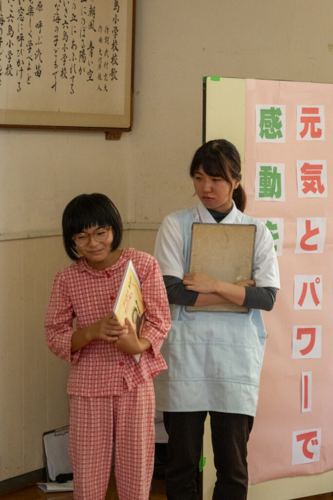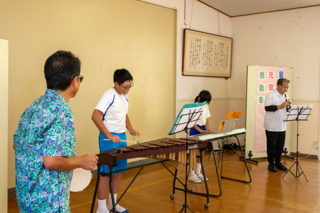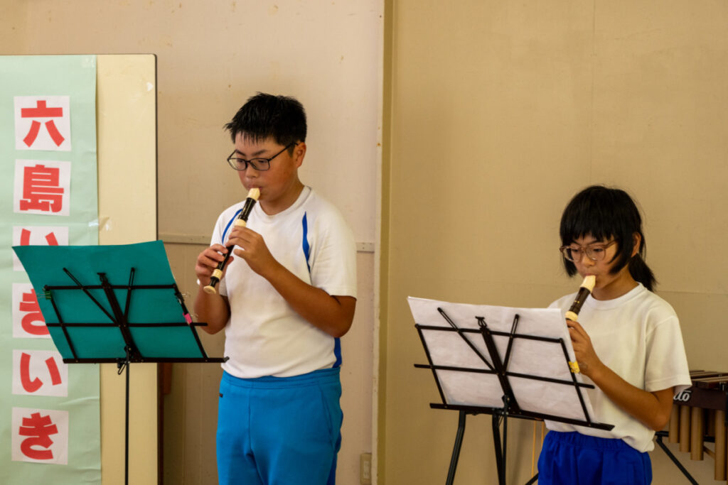 全体を和ませ、体を動かすゲームを2人の進行で最初に実施し、楽器演奏、劇なども校長先生をはじめ先生方も一緒に練習された成果を発表されました。最後に、六島の活性化のためのアンケート調査に基づく地域学の発表がありました。グラフを用いてわかりやすいプレゼンで、今年の六島塾で実施予定の案内板設置やマップづくりを島民の方々と一緒に行う予定だということで、実践型の取組が行われています。